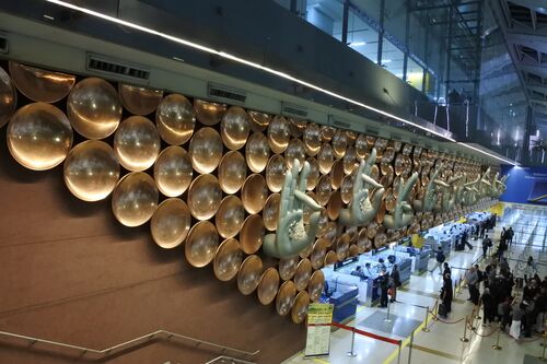 その8いよいよインドです☆外はなんか靄が掛かっていて悪い意味でインドっぽいw到着口は普通だけどちょっと足下のカーペットとか汚そう(イメージ)。でもぼろいから到着口から15分ほど歩かされてやっと到着フロア。(ぼろくそw)何のモニュメントなんでし…